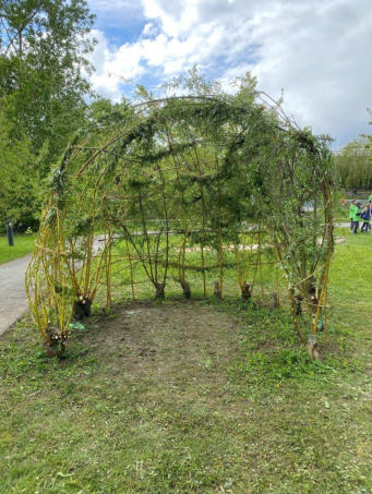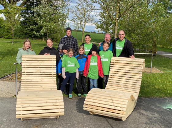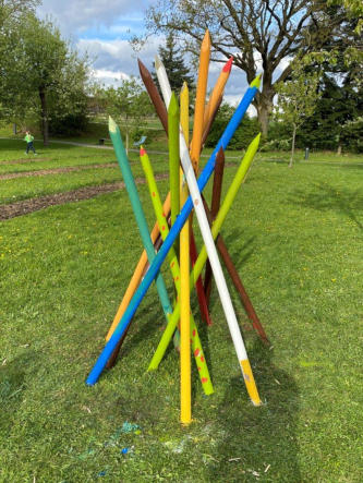 wie auch ein Klient der Stiftung zusammen mit Fr. Stefanie Ries und Hr. GR Manfred Höchenberger  im Rahmen der 72-Stunden-Aktion des BDKJ. Dabei wurde in der Stiftung Sankt Johannes in Schweinspoint ein Weiden-Tipi, der Barfuß-Pfad und die großen Buntstifte wieder aufgehübscht und es entstanden zwei Sitz- bzw. Liegebänke.